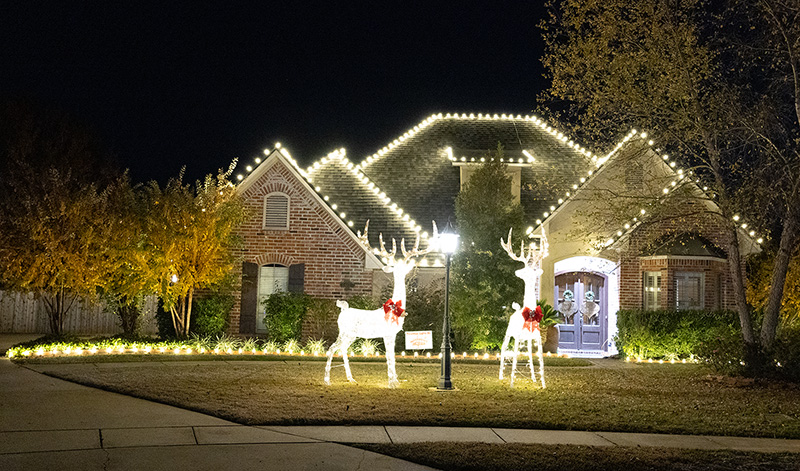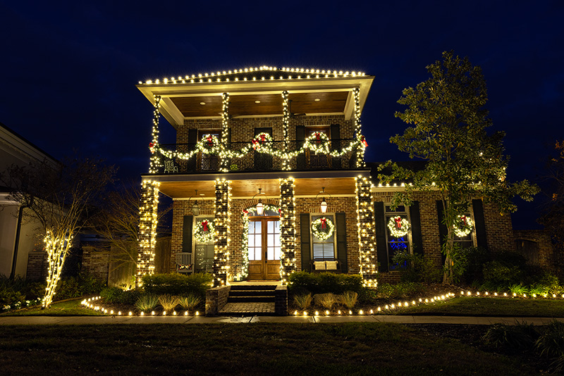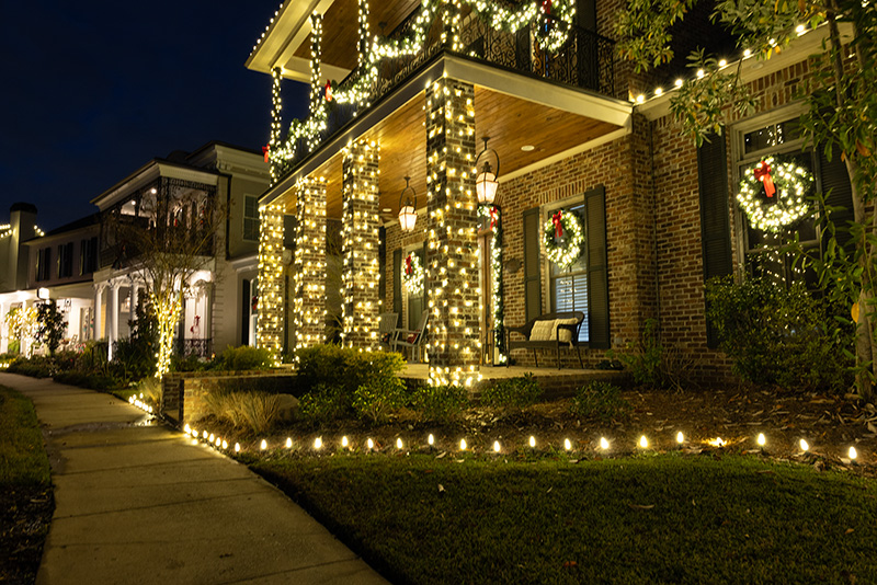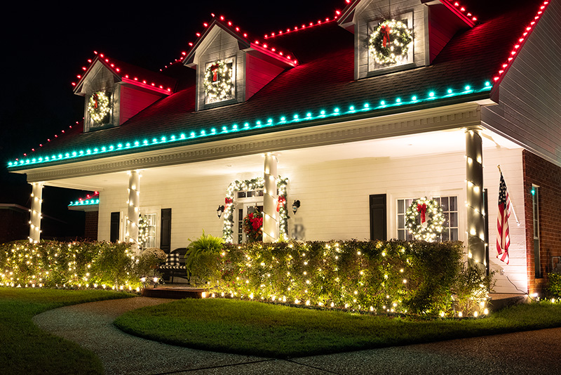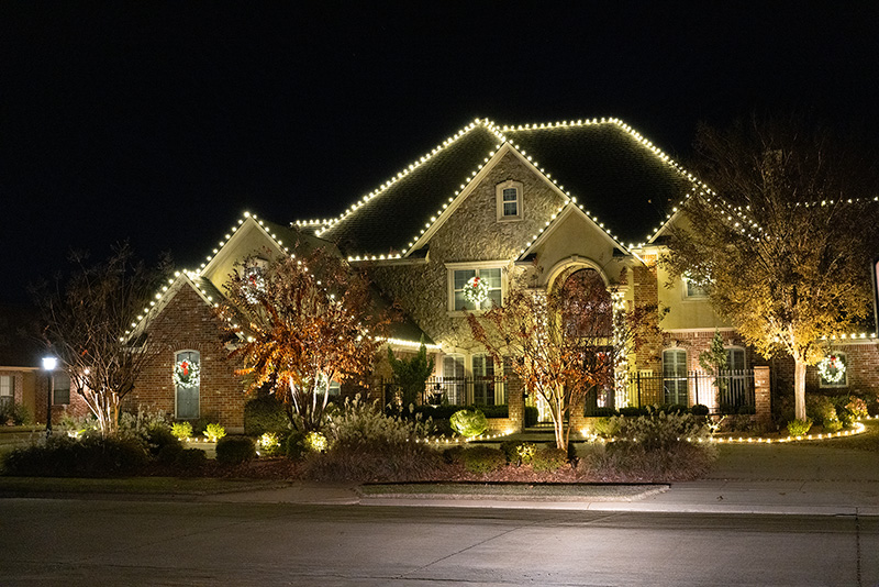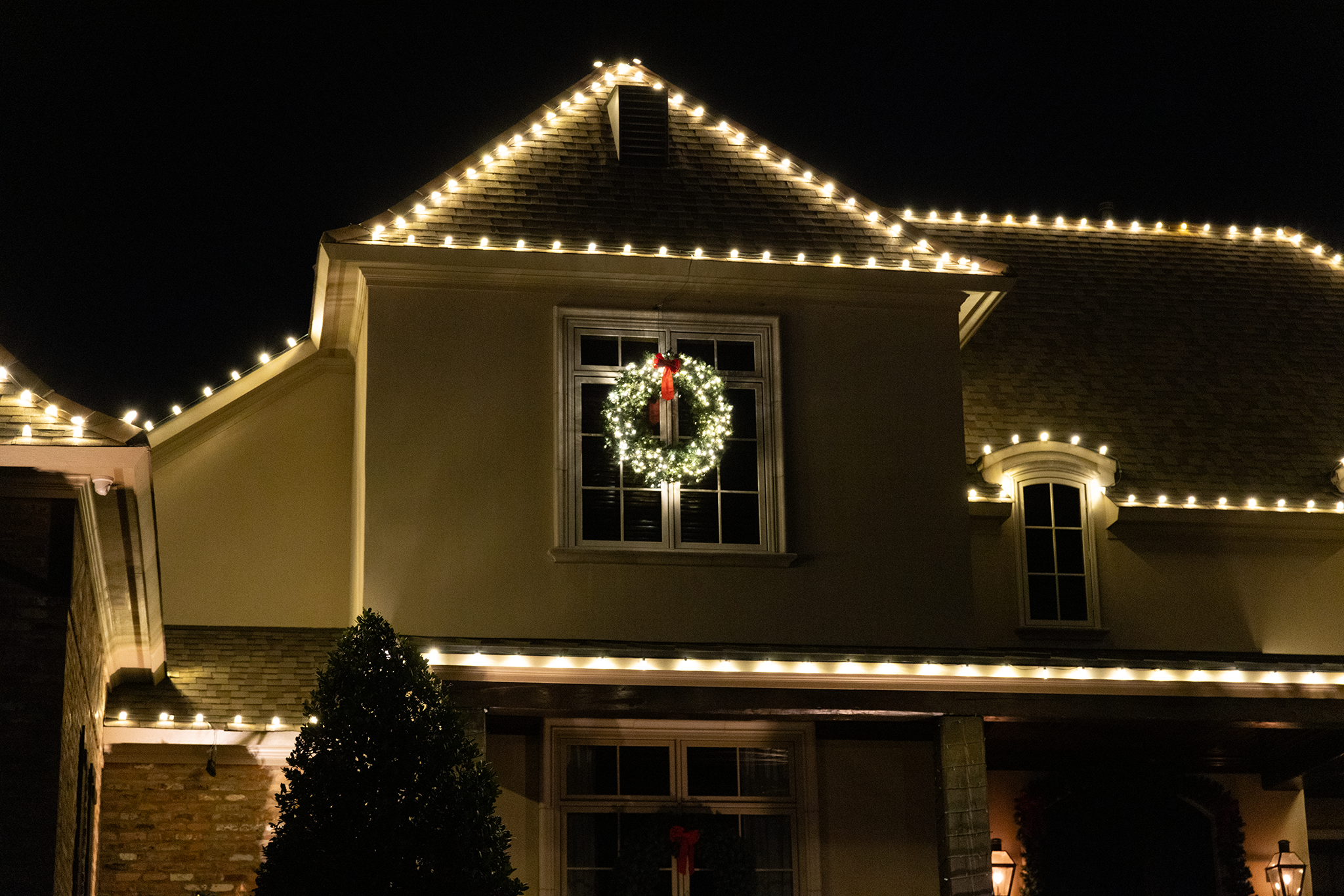 We have been in the Christmas lights installation business since 2008. Our focus has always been on making the installation and maintenance of your lights display a stress-free part of your holiday celebration. We measure and provide all of the custom-fit materials to our clients for their install (mini lights, garland, and wreaths also available). After the holidays, we then come back and remove the lights, box them up, and then store them – free of charge!